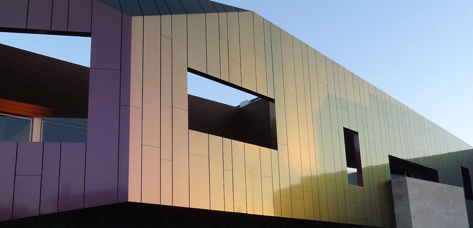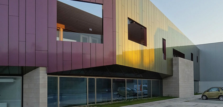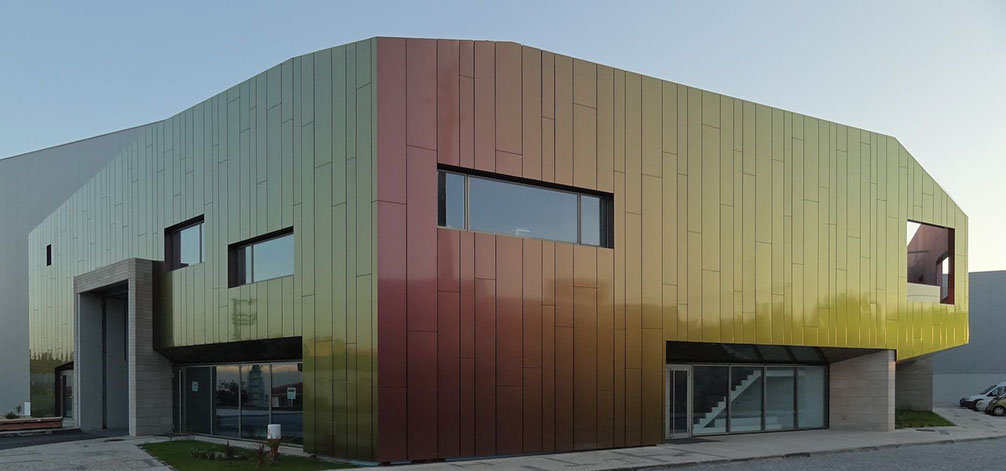 Fábrica de Estruturas Metálicas e Equipamentos Industriais em Leiria, na Zona Industrial da Cova das Faias - ZICOFA. A área de escritórios do edifício foi revestida com um painel de alumínio inovador, que muda de cor conforme a incidência do sol e o ponto de visão. A sua forma, com paredes em diversos ângulos, optimiza essa característica do material, fazendo lembrar o brilho de uma jóia. A preocupação com a qualidade dos acabamentos utilizados reflete o carácter da empresa, cujas instalações ocupam o maior lote da zona industrial de Leiria.